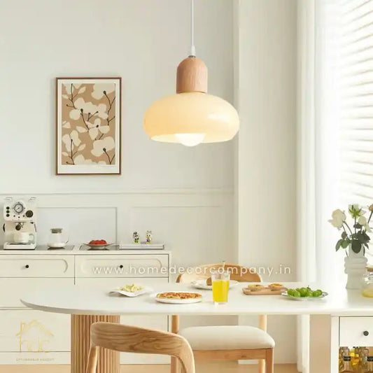 HDC Wood Dome Pendant Light Cream Glass Pendant Lighting for Dining Room Bedroom Bedside Living Room