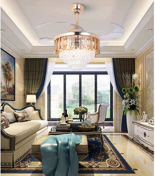 Hdc Invisible Gold Black Ceiling Fan Chandelier With K9 Crystal And Remote Control 4 Retractable Abs Blades - Tricolor