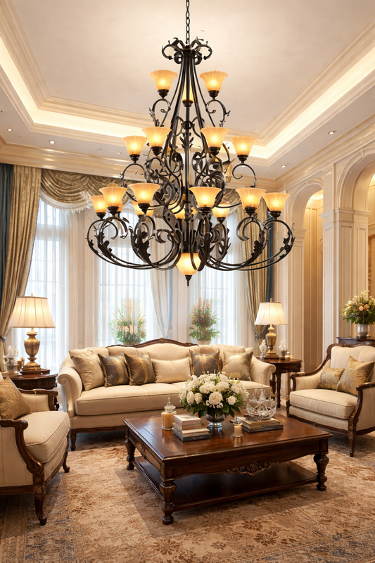 HDC Luxury 16 Lights Multi-Tier Classic Iron Chandelier with Frosted Glass Shades for Living Room