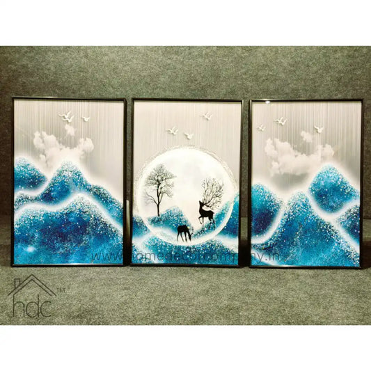 Hdc Modern Crystal Glass Painting of Majestic Blue Mountains and Hillside Harmony Horizontal Framed Wall Art Home Decoration with Golden Frame Canvas Print- 3 Pieces, 16x24 inches