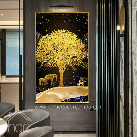 Hdc Luxury Modern crystal Painting of Golden Tree Family of Elephant & Deer for Home Decor and Living Room Decoration with Golden Frame Canvas Print- 24x48 inches