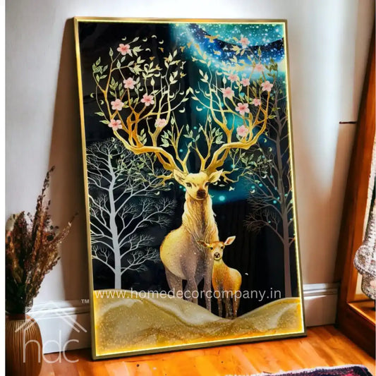 Hdc Luxury Modern crystal Painting of Christmas Deer for Home Decor and Living Room Decoration with Golden Frame Canvas Print- 24x48 inches