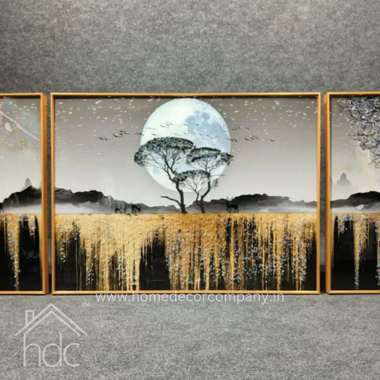 Hdc Modern Crystal Painting of Golden Nights Moon Tree Textured Art Horizontal Framed Wall Art Home Decoration with Golden Frame Canvas Print- 2 Pieces, 16x24 inches 1 piece 24x32 inches