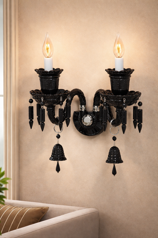 HDC Classic Black Crystal Wall Light with Dual Candle Holders | Luxury Decorative Wall Sconce for Living Room, Bedroom & Heritage Interiors