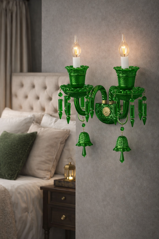 Hdc Vintage Green Glass Double Arm Wall Light Handcrafted Decorative Wall Sconce with Crystal Drops for Living Room & Bedroom