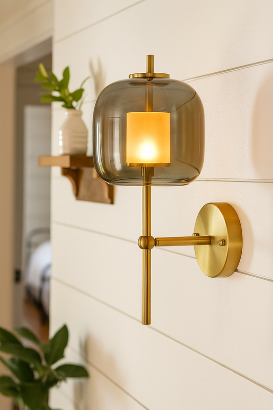 Hdc Amber/Smoke Glass Wall Light Brass Gold Metal Bedroom Living Room Wall Light - Tricolor
