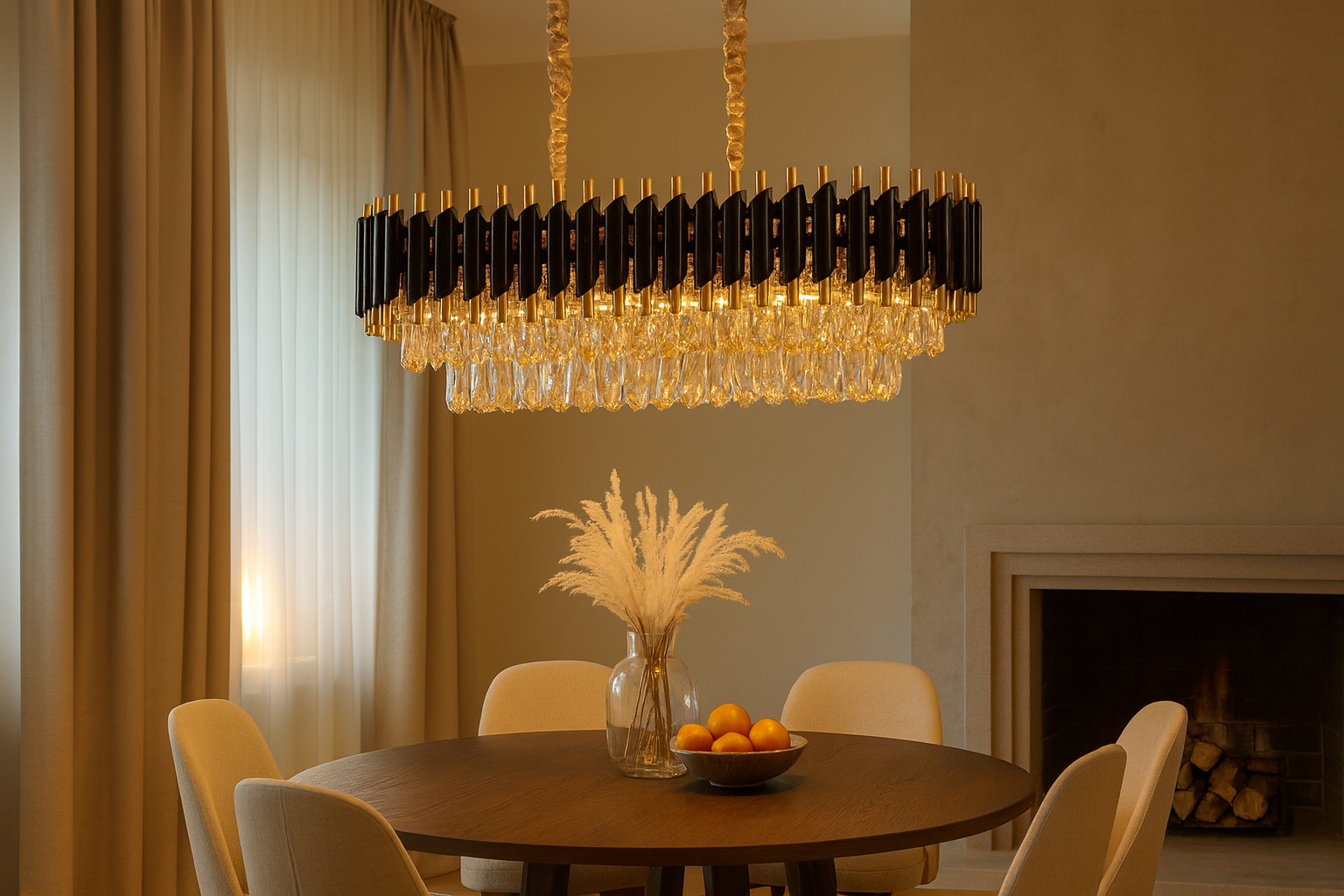 Crafted for premium dining rooms and living spaces, this chandelier features a bold Black-and-Gold frame paired with multi-layered precision-cut crystals. The elongated 1200mm structure delivers a commanding visual presence ideal for long dining tables and high-end interiors. -