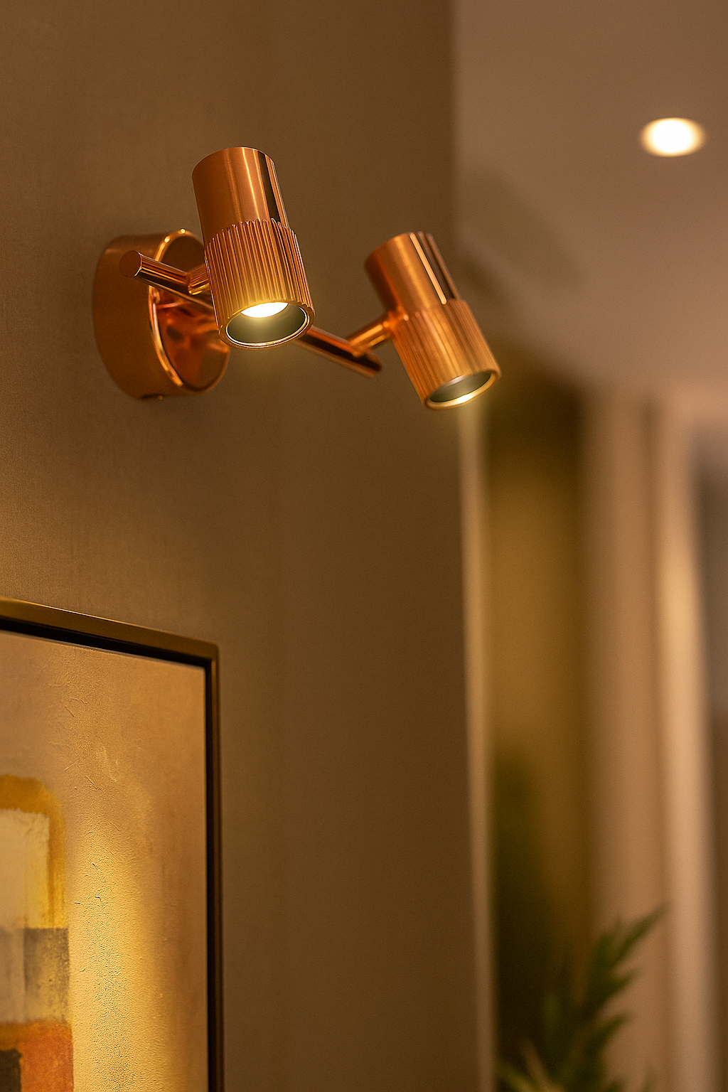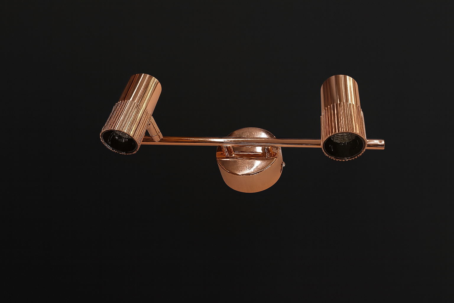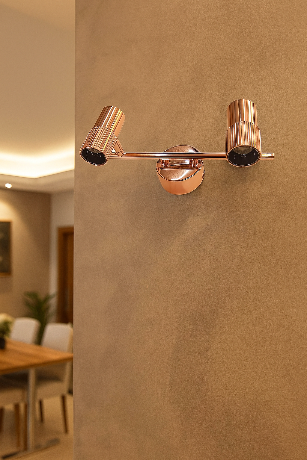 - Luxurious Twin-Barrel Design: Features two cylindrical spotlight heads on a polished rose gold arm, offering a timeless aesthetic that complements luxury homes, galleries, and modern interiors.