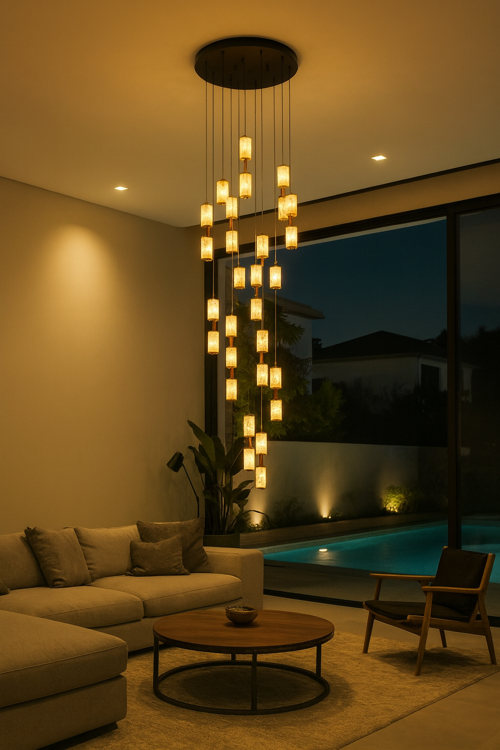 - Multi-Tier Cascade Structure: Designed with multiple LED pendants at varying lengths for a cascading waterfall effect, enhancing architectural height and visual depth.