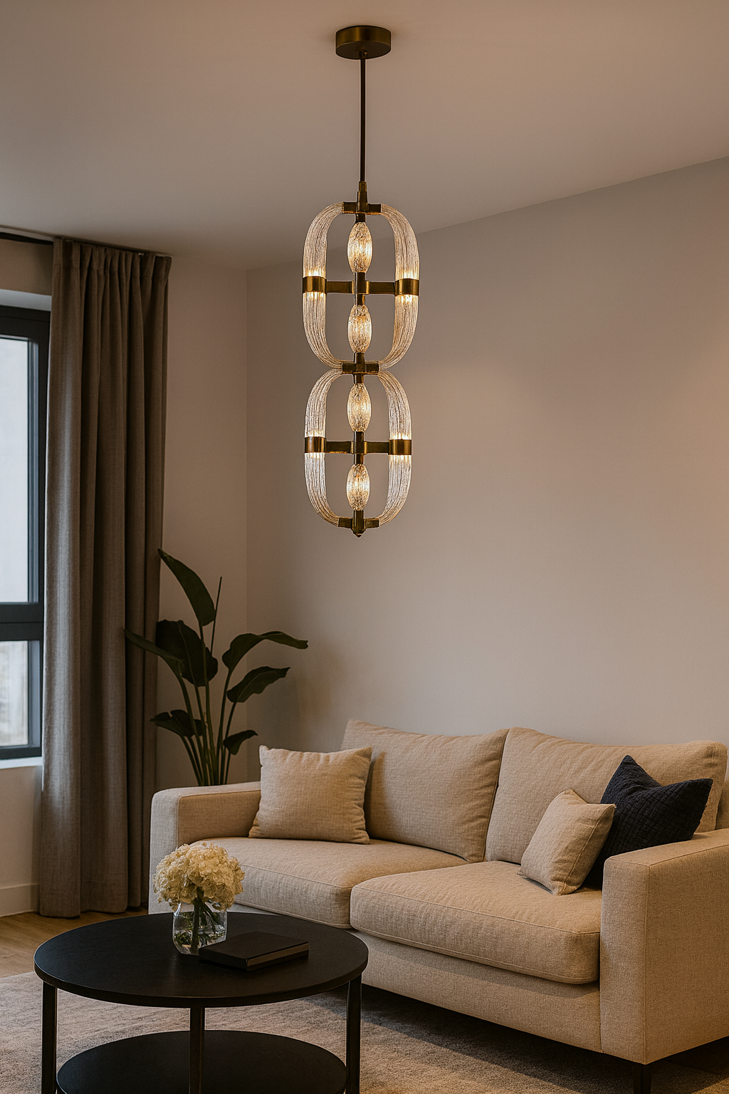 - Vertical pendant format makes it ideal for double-height spaces, staircases, dining areas, foyers, and designer living rooms