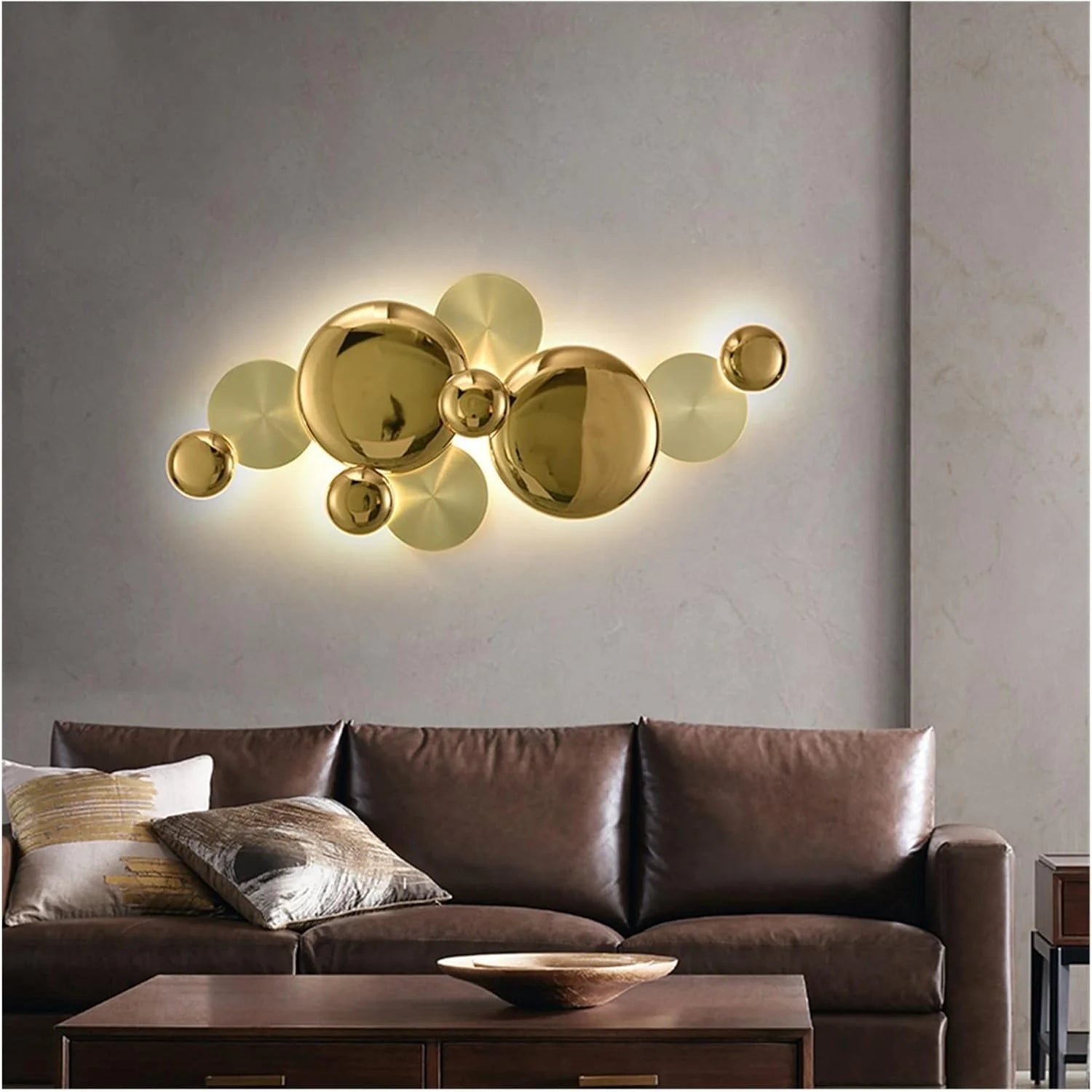 - A wall-mounted light fixture composed of various sized, polished gold-colored circles and spheres.
