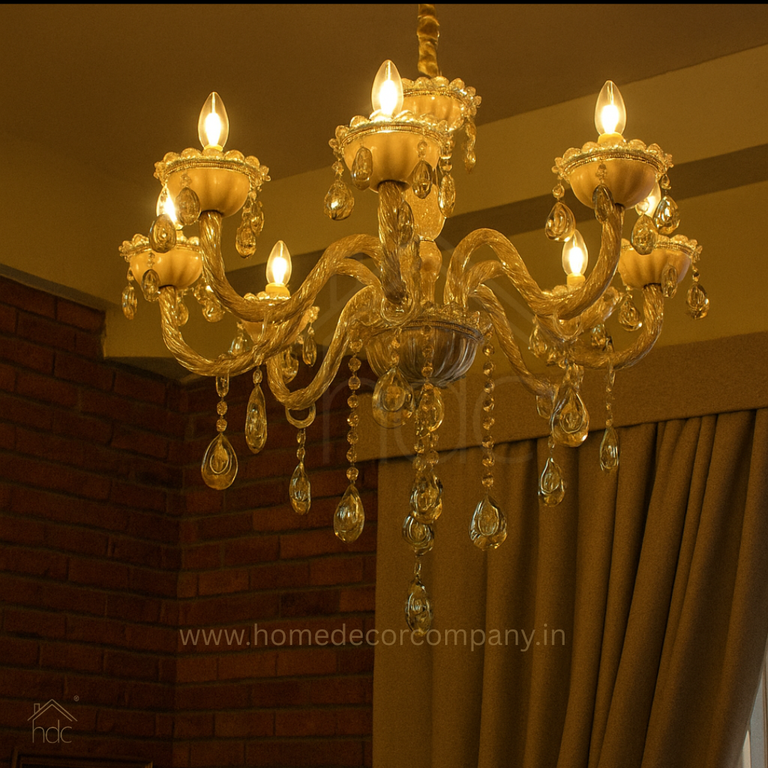 Features eight beautifully curved arms crafted entirely from premium amber-toned glass, each supporting candle-style light holders that create a warm and aristocratic ambiance. -