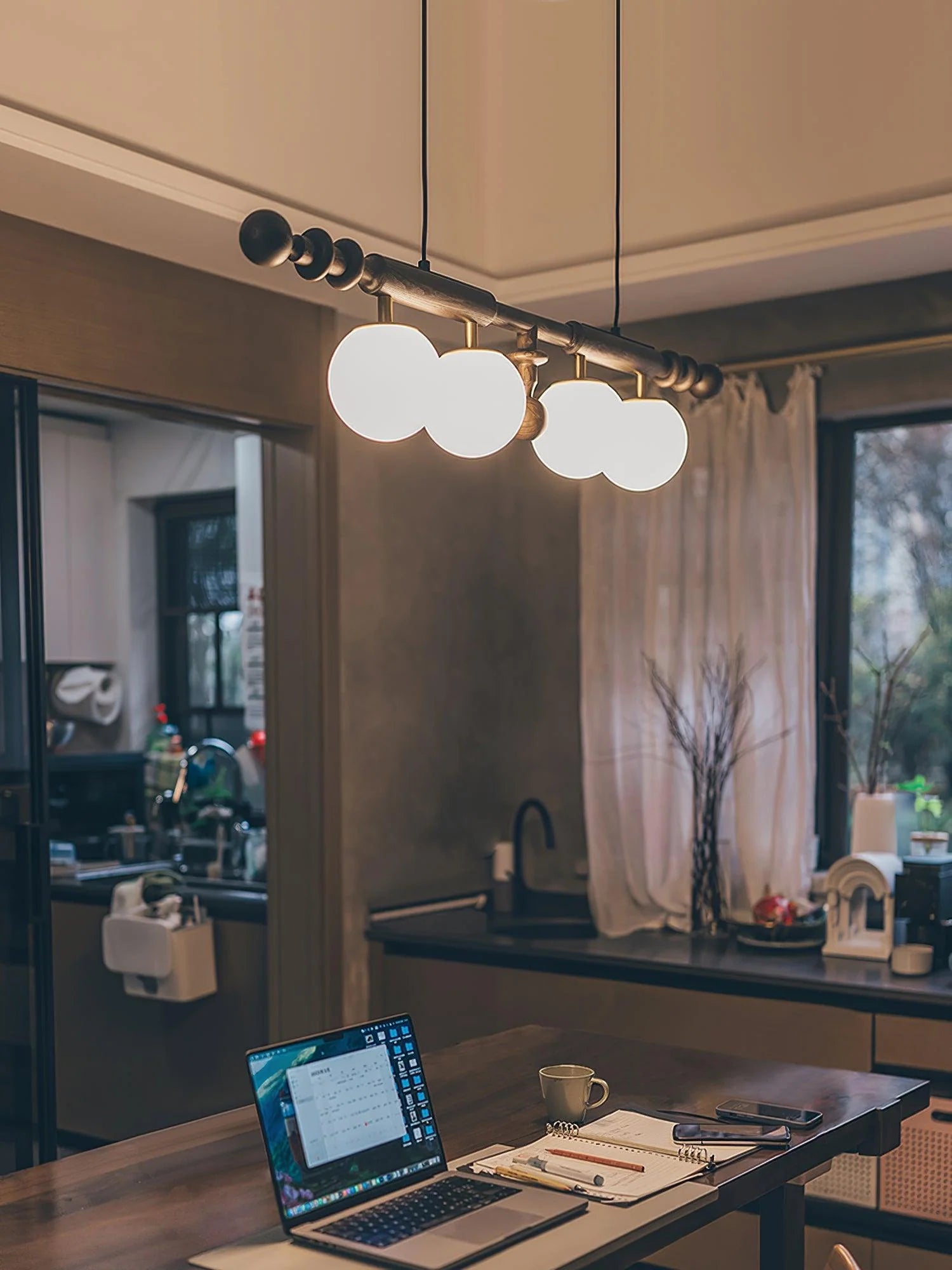 Multiple spherical opal glass globes diffuse light evenly, creating a soft, glare-free ambient glow ideal for dining tables, kitchen islands, breakfast counters, or contemporary living spaces. -