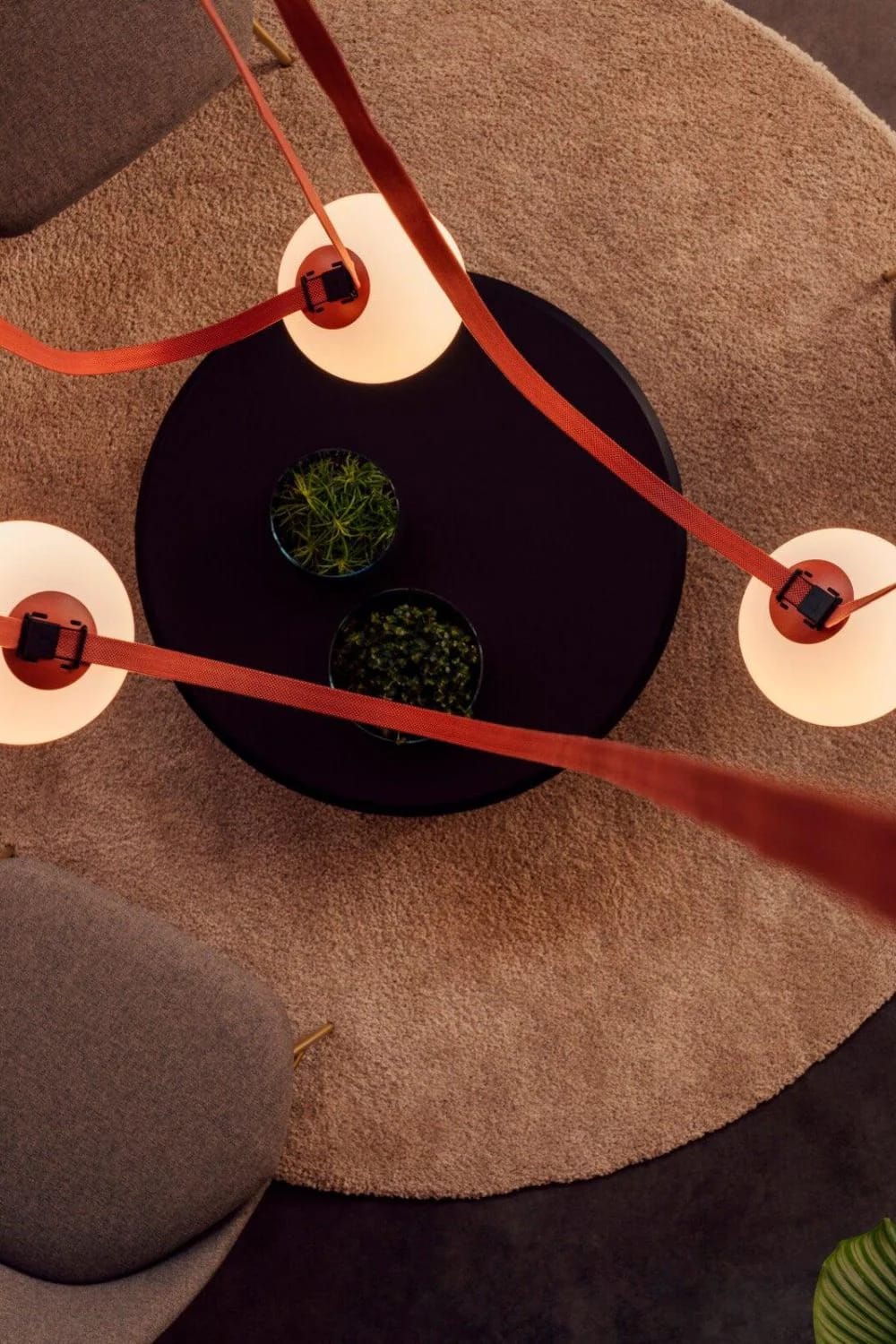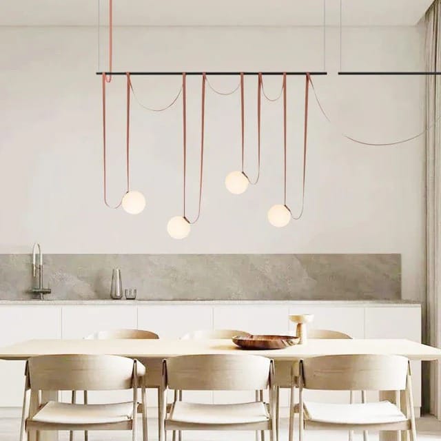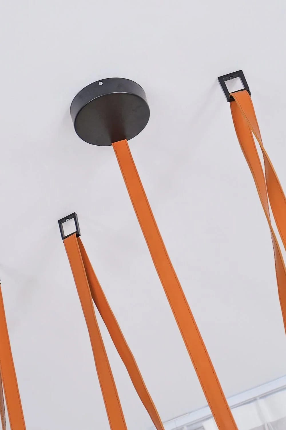 - Artistic Leather-Loop Suspension Design: Features a unique arrangement of premium tan-brown leather straps that drape elegantly from a sleek black bar, creating a modern, sculptural lighting effect ideal for dining rooms, cafés, and contemporary homes.