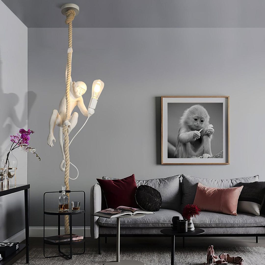 Features a creatively sculpted monkey figure holding a rope-style pendant, blending playful artistry with vintage industrial charm. A true conversation piece that elevates the character of any space. -