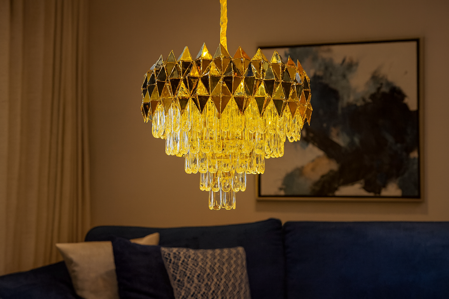 Crafted with a stunning geometric crown structure on the top and cascading premium crystal droplets below, this chandelier creates a luxurious visual presence. The faceted golden diamond-cut elements elevate the elegance of any interior, offering a rich, opulent glow that instantly transforms living rooms, hallways, dining areas, or boutique décor settings. -