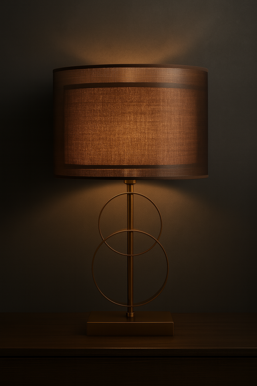 - The lamp base is a dark, bronze or copper color with two intersecting, circular metal rings attached to a vertical stem.