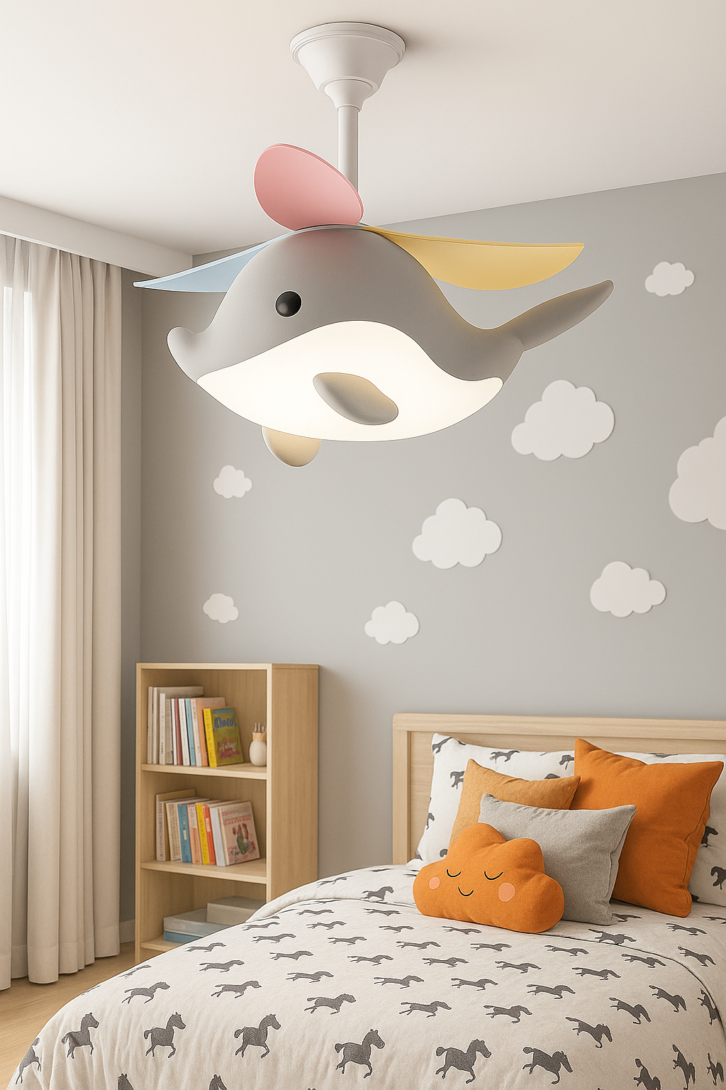 - Designed in the shape of a cute cartoon dolphin, this ceiling fan features colorful pastel blades and an integrated LED light, making it both fun and functional.