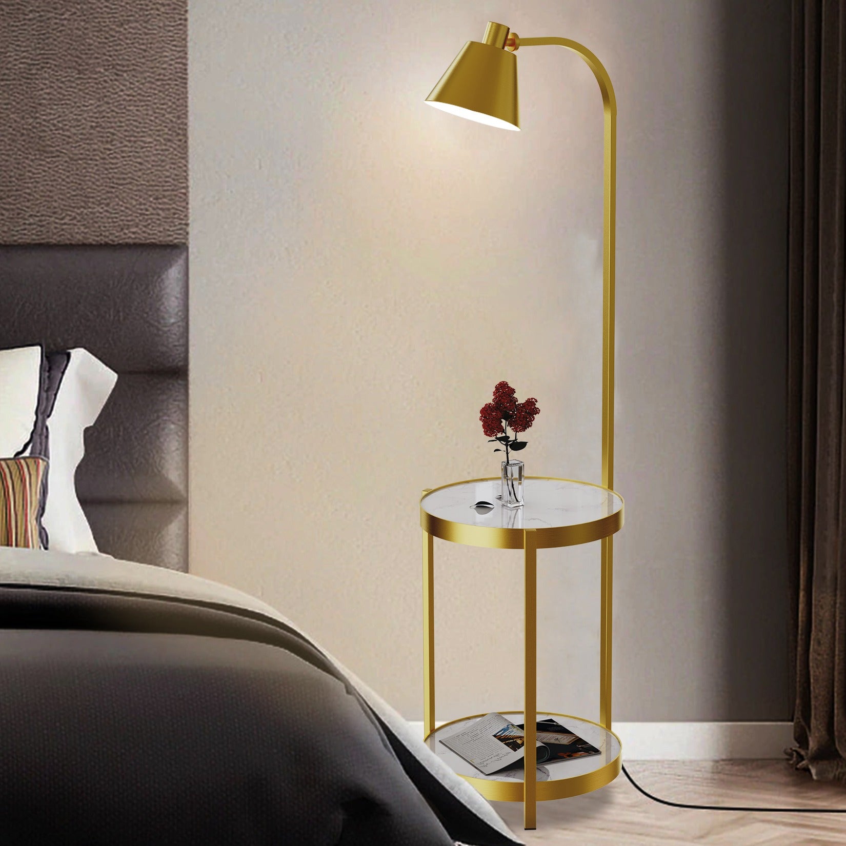 A perfect blend of style and practicality — combines a sleek floor lamp with a convenient side table, ideal for placing your phone, book, or décor items. -