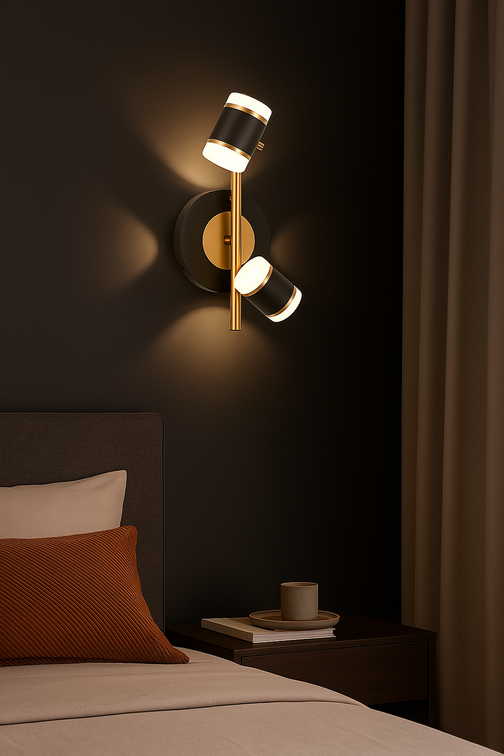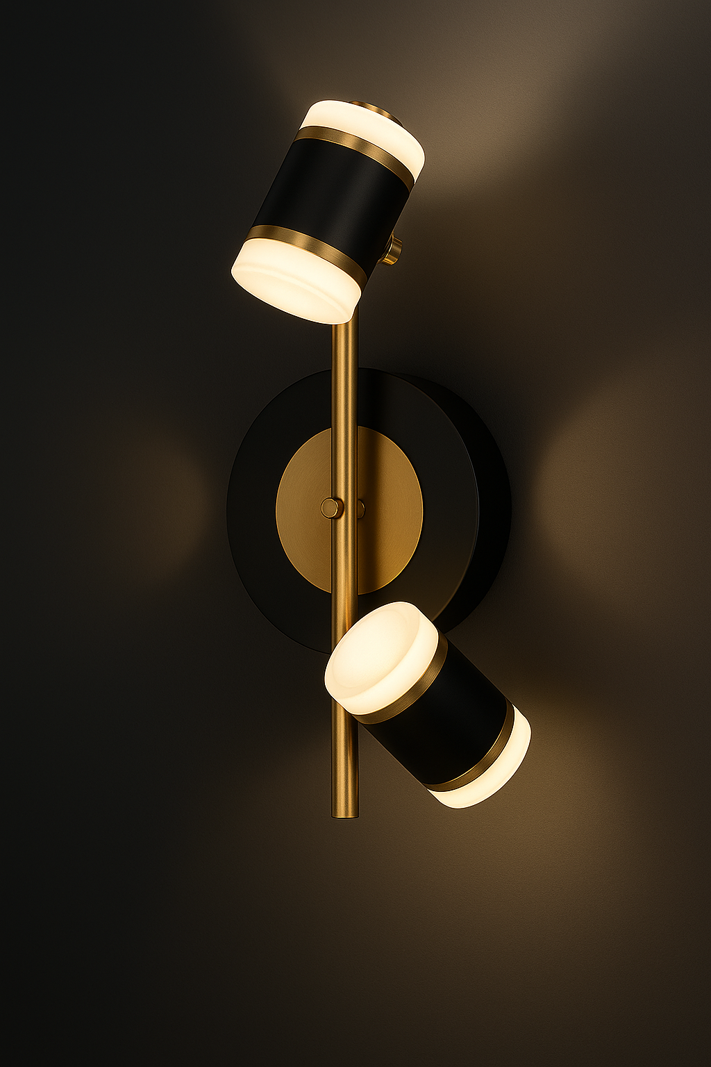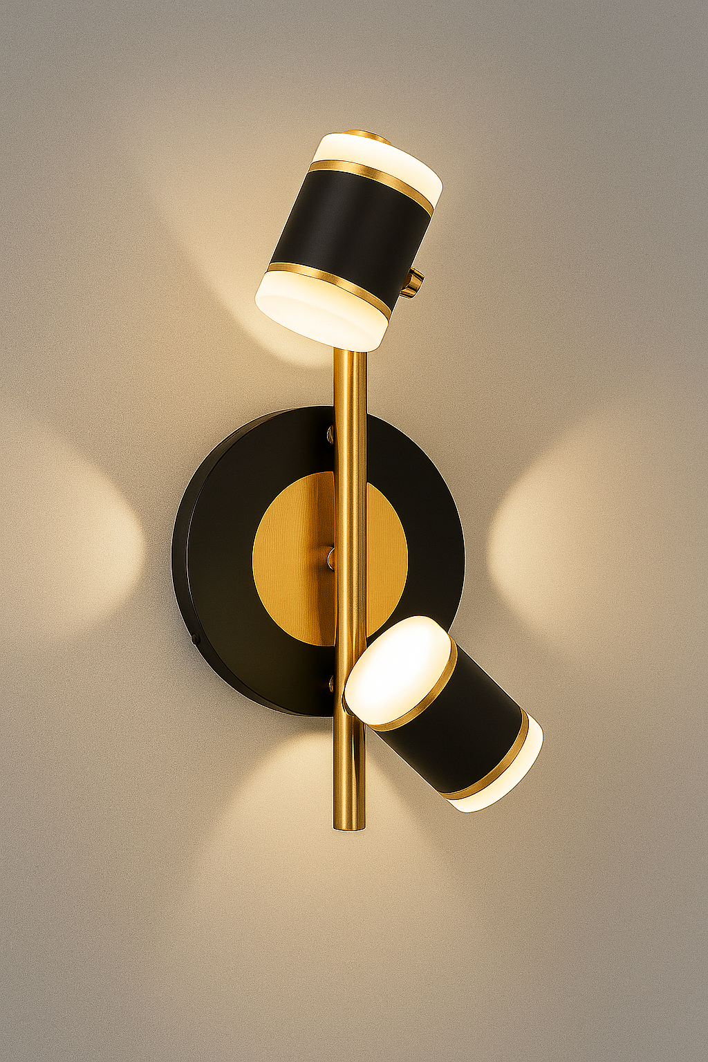 - Upgrade your interiors with this modern dual spotlight wall lamp, featuring a sophisticated black and gold finish. Designed to offer focused lighting with a contemporary touch, it’s perfect for bedrooms, living rooms, hallways, or accent walls.